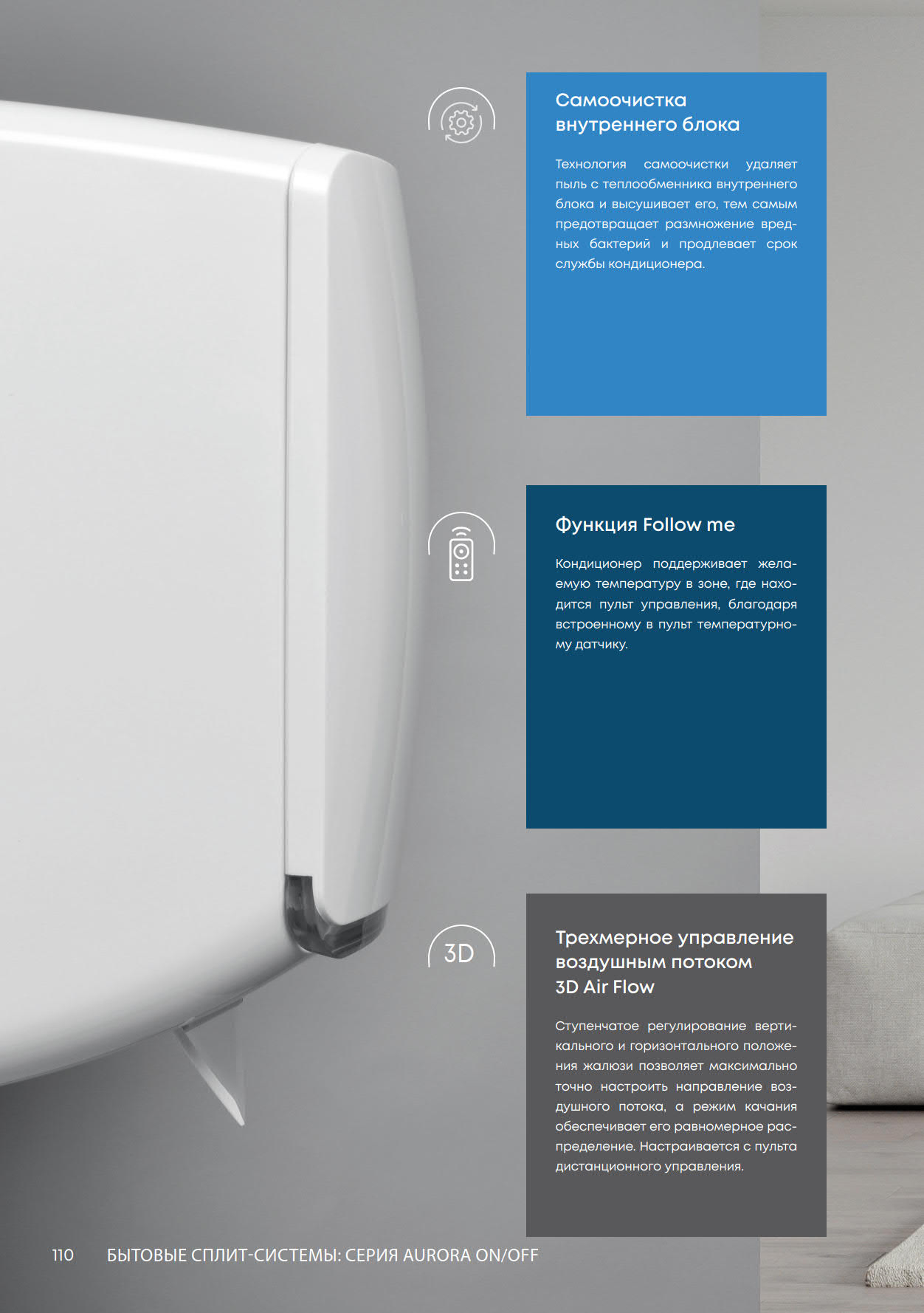 • Функция Follow Me. При активации этой функции кондиционер отслеживает температуру в помещении с помощью датчика, который расположен в пульте дистанционного управления. Если пользователь положит пульт рядом с собой, то комфортная температура будет обеспечена непосредственно в той части комнаты, где он находится.